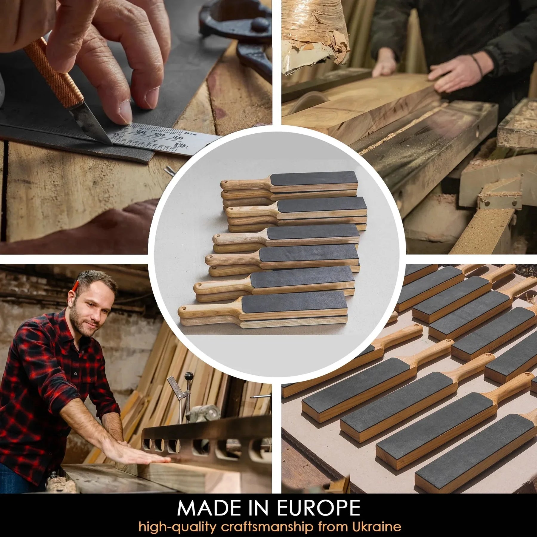 Med en base av solid ask og overflate i ekte kuhud, er stroppen bygget for holdbarhet og komfort. Det ergonomiske håndtaket gjør slipingen enkel og effektiv, uten å gå på kompromiss med presisjon.