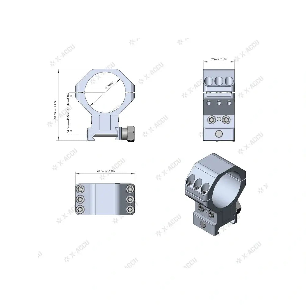X-ACCU 34mm montasjeringer er utviklet for skyttere som krever maksimal presisjon og fleksibilitet. Med CNC-maskinert 6061-T6 aluminium gir ringene en solid og pålitelig base for optikk med 34mm rørdiameter. Den justerbare høyden fra 34.5 til 40.5mm (målt fra montasjebunn til optikkens senter) gjør det mulig å tilpasse kikkerten til ulike våpenplattformer og behov.