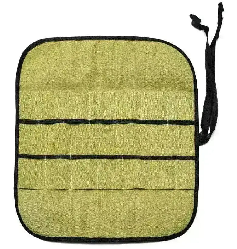 Praktikus és szép vászontáska összesen 12 kés és egyéb szerszámok számára. Csak feltekerve.