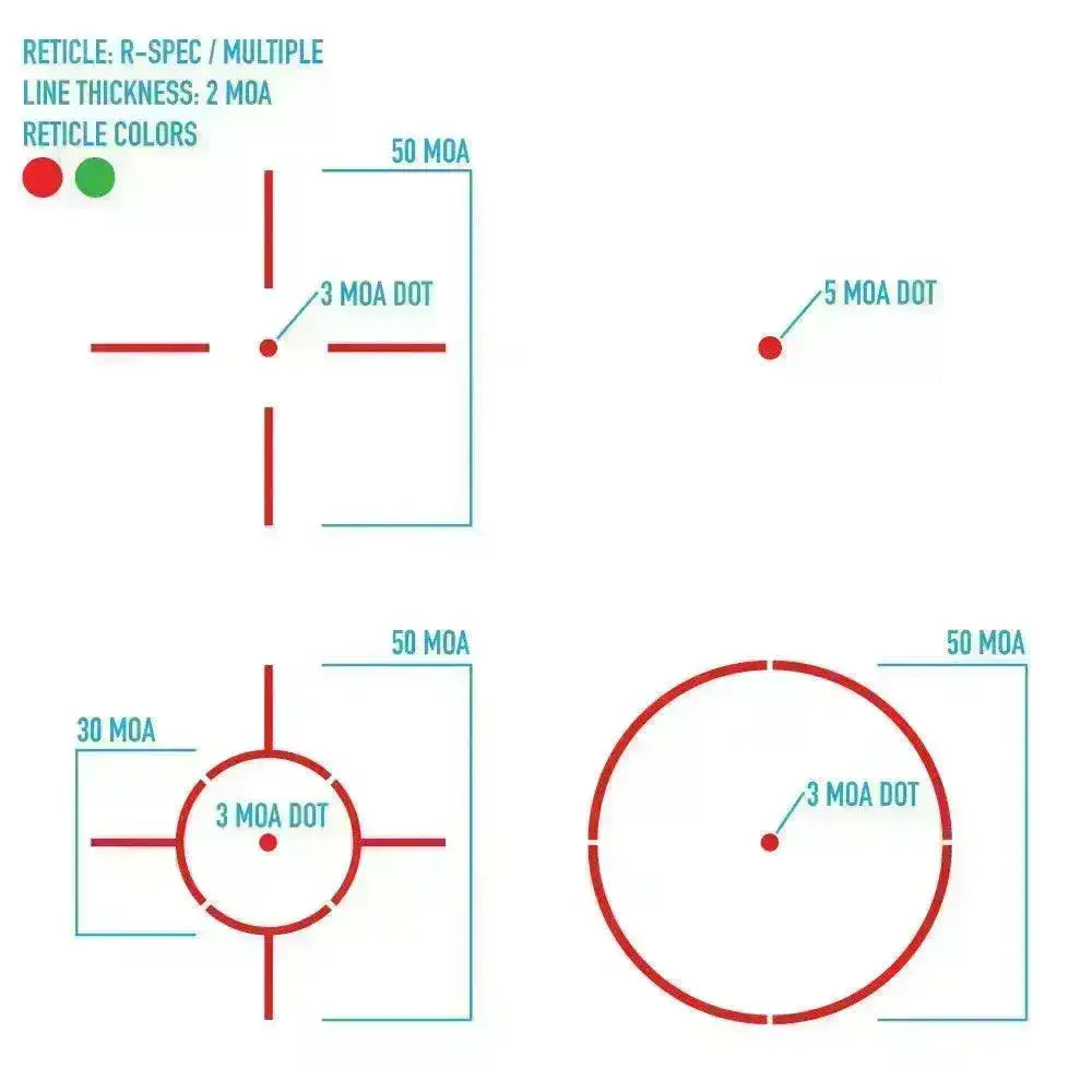 Széles látószögű, karcmentes lencse hosszú élettartamú objektívet ad. Könnyű 6061-T6 alumínium váz és test ami biztosítja, hogy az optika elbírjon egy kis kopogást. Az optika ütésálló, porálló, vízálló (IP55), és 0,50 Cal-ig visszarúgásteszttel rendelkezik.