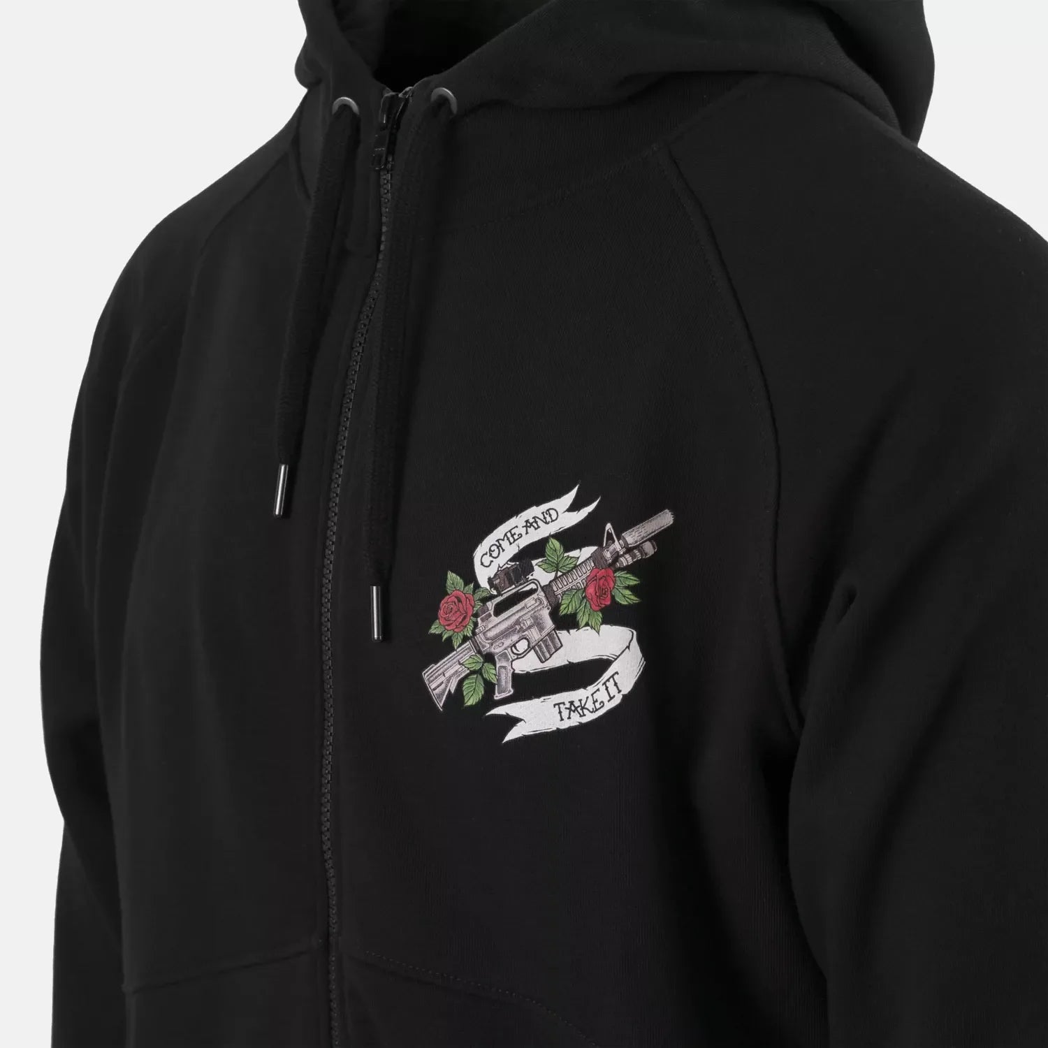 Trykket «Come and take it» viser til et historisk slagord knyttet til motstand og stahet. Uttrykket har røtter i antikken (ofte knyttet til uttrykket molon labe) og ble senere kjent fra Gonzales-flagget under Texas-revolusjonen i 1835. I dag brukes teksten mest som et kulturelt og historisk nikk, her i en nedtonet, grafisk utgave som ikke dominerer genserens uttrykk.