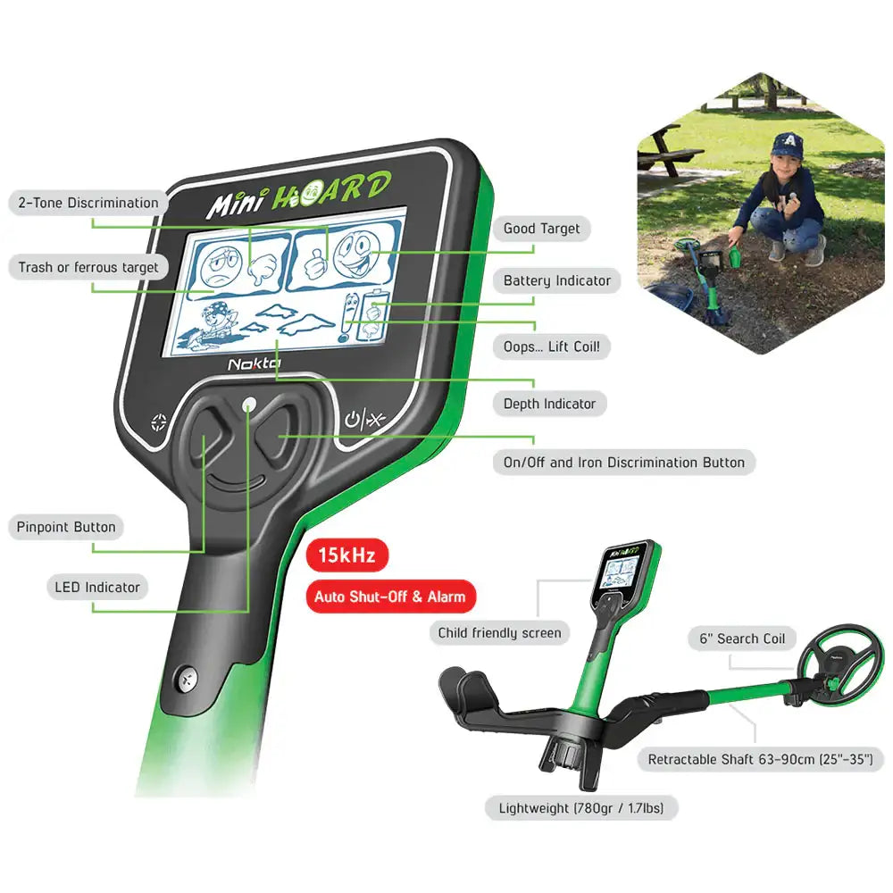 Mini Hoard fra Nokta er en lett og robust metalldetektor utviklet for barn fra ca. 4–8 år. Den er vanntett, enkel å bruke og gir ekte deteksjonsopplevelser – akkurat som en fullvoksen detektor. Perfekt for å inspirere barn til å utforske naturen og skape egne eventyr i hagen, på stranden eller på hytta.