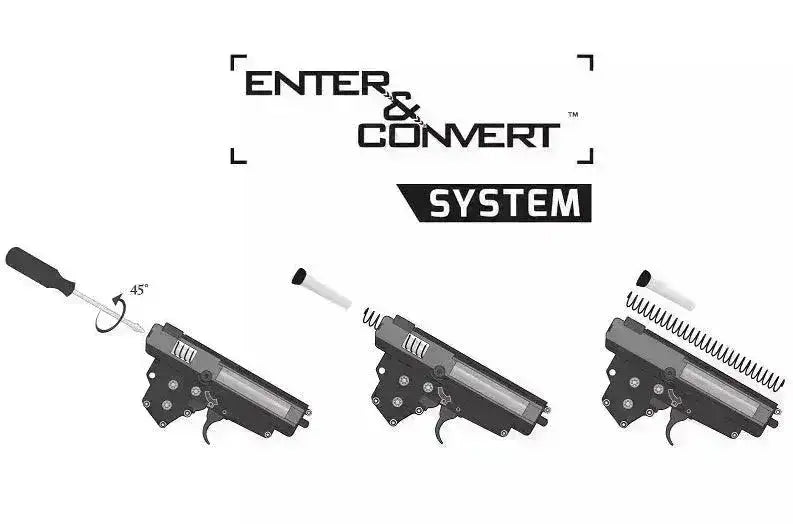 Ez a puska közvetlenül a dobozból 380 fps-t produkál. Tökéletes közepes távolságokra. Ha zárt térben fog játszani / CQB, javasoljuk, hogy váltson a mellékelt M90 rugóra, amely körülbelül 310 fps-re csökkenti. Ez gyerekjáték az Enter and convert rendszernek köszönhetően – amely lehetővé teszi a rugók pár perc alatti cseréjét anélkül, hogy az egész puskát szét kellene szerelni.