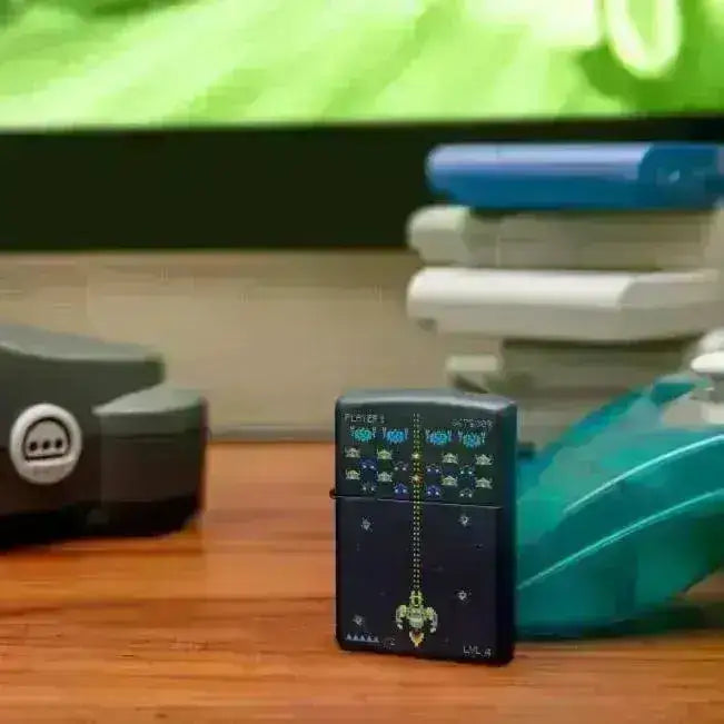 Retro gaming Zippo játékosoknak és mindenkinek, aki szereti a retro dolgokat - Matt sötétkék háttér pixel játéknyomattal