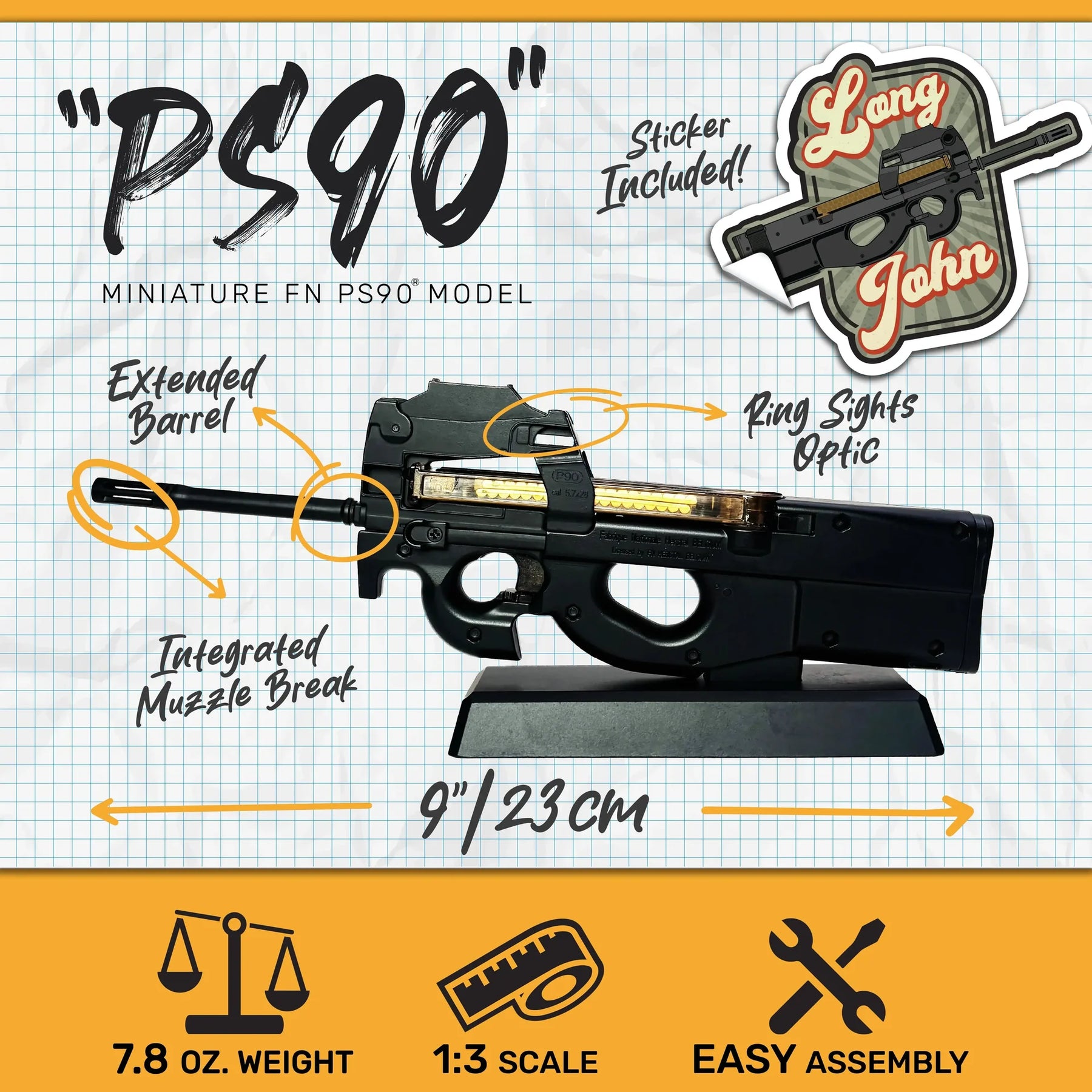 Dette er en offisielt lisensiert, statisk modell av FN PS90 – designet for å være en autentisk og detaljert kopi til utstilling og dekorasjon. Modellen har realistiske proporsjoner og funksjonelle detaljer som bevegelig bolt og avtakbart magasin med dummy-patroner, og leveres med en praktisk utstillingsstand.