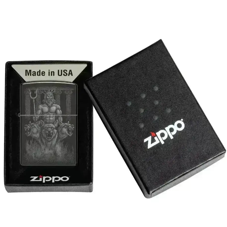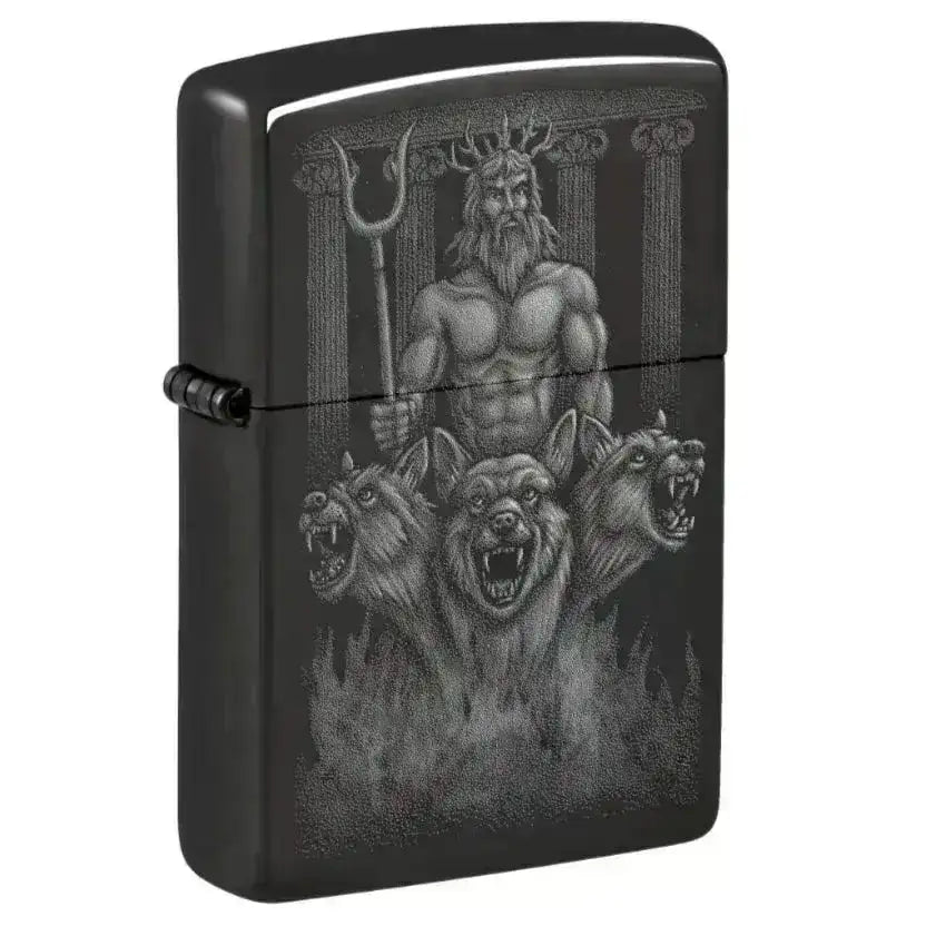 Nagyszerű Zippo öngyújtó High Polish Black színben, lenyűgöző dizájnnal, amelyen egy hatalmas isten látható, mellette őrzőkutyák. Ez a megbízható és stílusos öngyújtó funkcionális és dekoratív elem, ideális mindennapi használatra vagy ajándéknak.