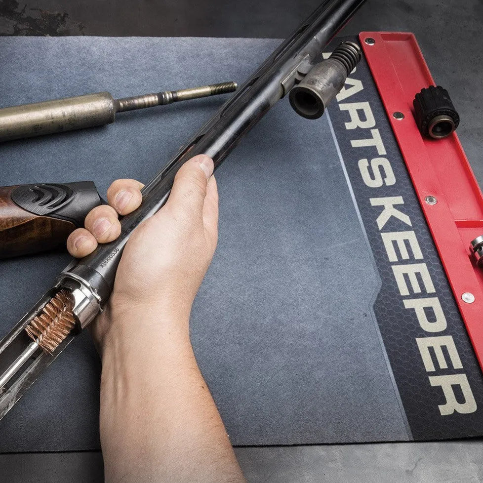 Matten har et slitesterkt belegg som både er olje- og vannavvisende, noe som beskytter både våpenkomponenter og bordflate. Undersiden er utstyrt med sklisikkert materiale for ekstra stabilitet under bruk. Den innebygde deleskålen med magnetisk seksjon holder smådeler og skruer på plass gjennom hele prosessen – perfekt for å unngå tapte komponenter.