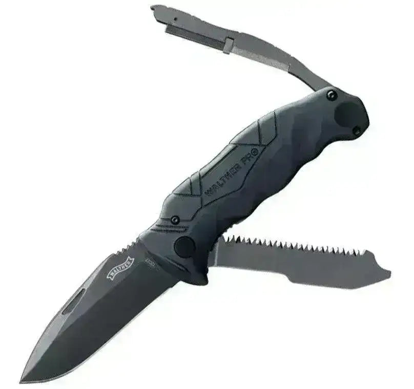 Ezt a Pro Survival összecsukható kést a minőségi német Walther gyártó készítette. A késhez tartozik egy beépített késélező és egy "tűzgyújtó", amely gyorsan szikrákat hoz létre a kés pengéjével kombinálva, amely 12C27 Sandvik acélból készült! A kés pengéjének elülső része speciális kialakítású, amely kifejezetten a "tűzgyújtóval" való használatra készült. Ezen kívül a kés egy "rejtett" kis fűrésszel is fel van szerelve, amely megkönnyíti az ágak és egyéb anyagok befűrészelését!