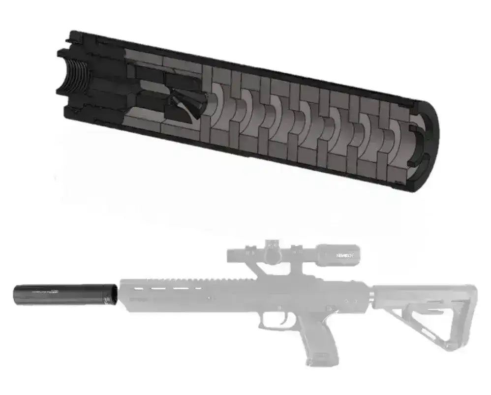 Hangtompító airsofthoz csillapító hatással. A lengéscsillapító ugyanolyan típusú alumíniumból készül, mint a repülőgépeken, a csappantyú belsejében lévő hab ugyanolyan típusú, mint a hangstúdiókban, hogy minél több hangot nyeljen el. Szintén ellenőrizze borító a Novritschtól.