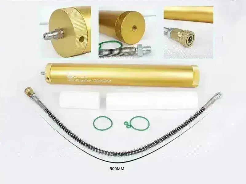 A szűrő különféle tömítésekkel és egy 500 mm hosszú töltőtömlővel érkezik QD gyorscsatlakozóval (standard 8 mm). Maga a szűrő dugasz QD gyorscsatlakozóval rendelkezik.