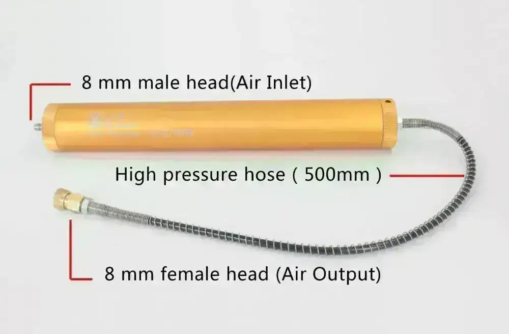 A szűrő csatlakoztatható a töltőállomás (például búvártartály vagy kézi szivattyú) és a légpisztoly közé.