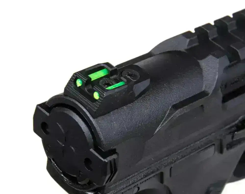 Ez a stílusos kompakt változat felül és alul 21 mm-es sínekkel van felszerelve az optika és a zseblámpa/lézer rögzítéséhez.