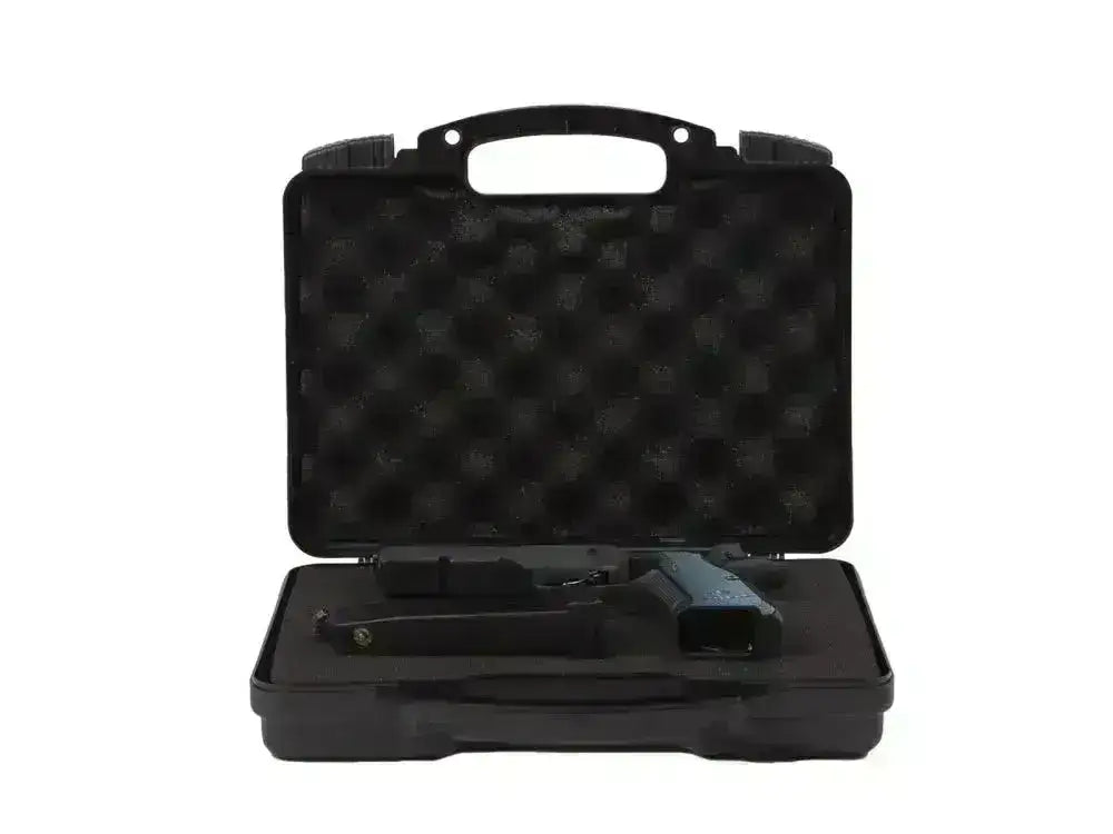 Praktikus fegyvertartó puha habbal a belsejében, amely mindent stabilan és biztonságosan a helyén tart. A bőrönd kemény műanyag héjjal és fogantyúval rendelkezik. A bőrönd egymásra rakható.