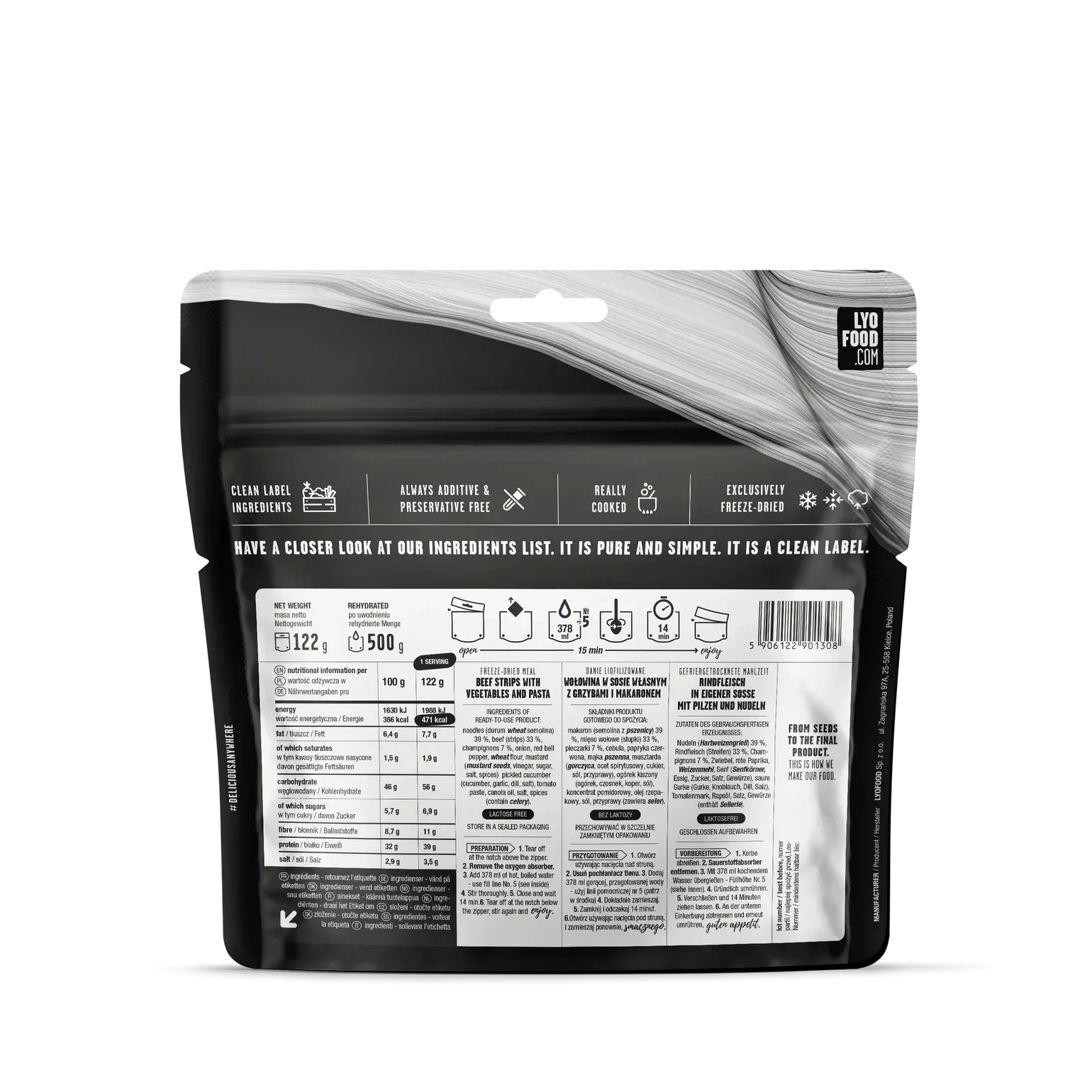 LYOFOOD Biff Stroganoff gir deg en ekte smaksopplevelse med møre biffbiter, sopp og en kremet paprikasaus. Perfekt for deg som ønsker en varmende og næringsrik middag på tur. Retten er laget med 100 % naturlige ingredienser, ingen konserveringsmidler, og frysetørket for lav vekt og lang holdbarhet.