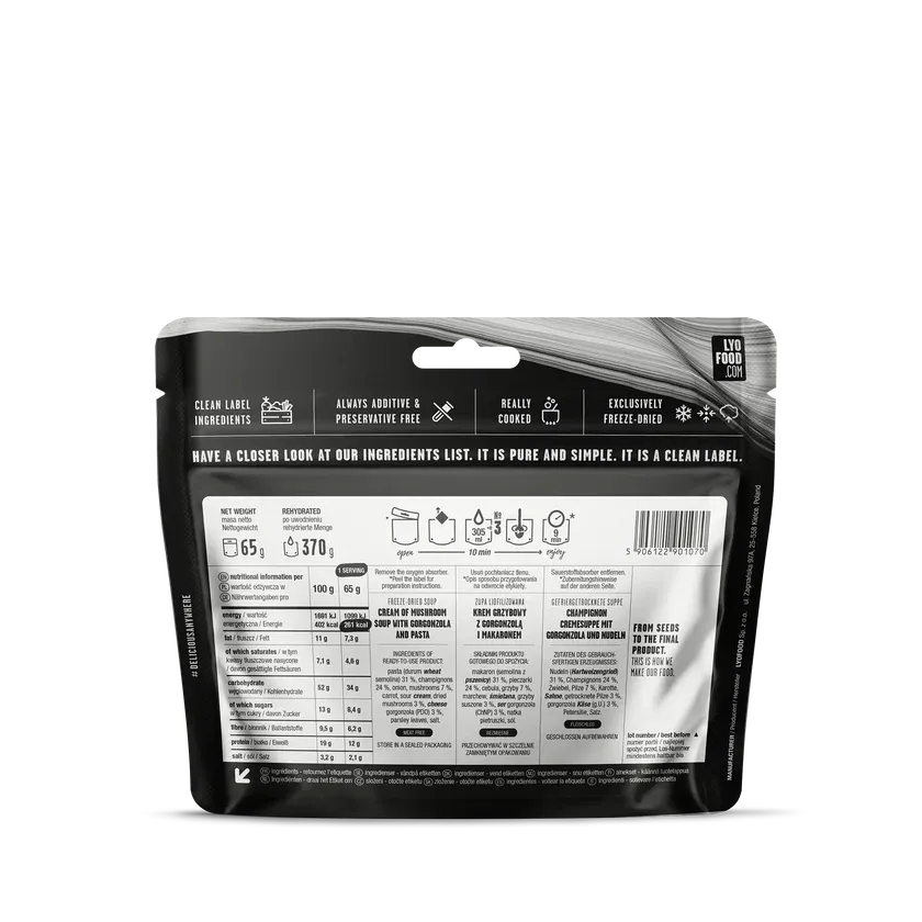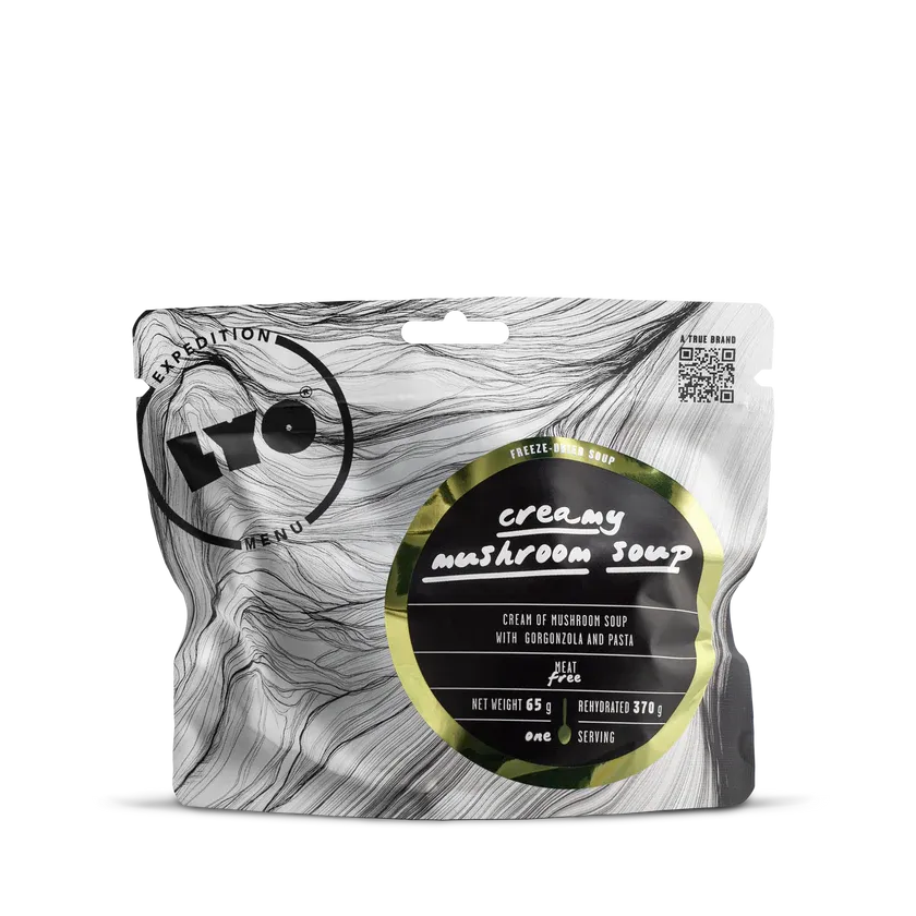 LYOFOOD Creamy Mushroom Soup er en kremet suppe laget med ekte sjampinjong, poteter og fløte. En varm og næringsrik rett perfekt for fjellturer, camping og ekspedisjoner. Laget med 100 % naturlige ingredienser, uten gluten eller kunstige tilsetningsstoffer, og frysetørket for lav vekt og lang holdbarhet.