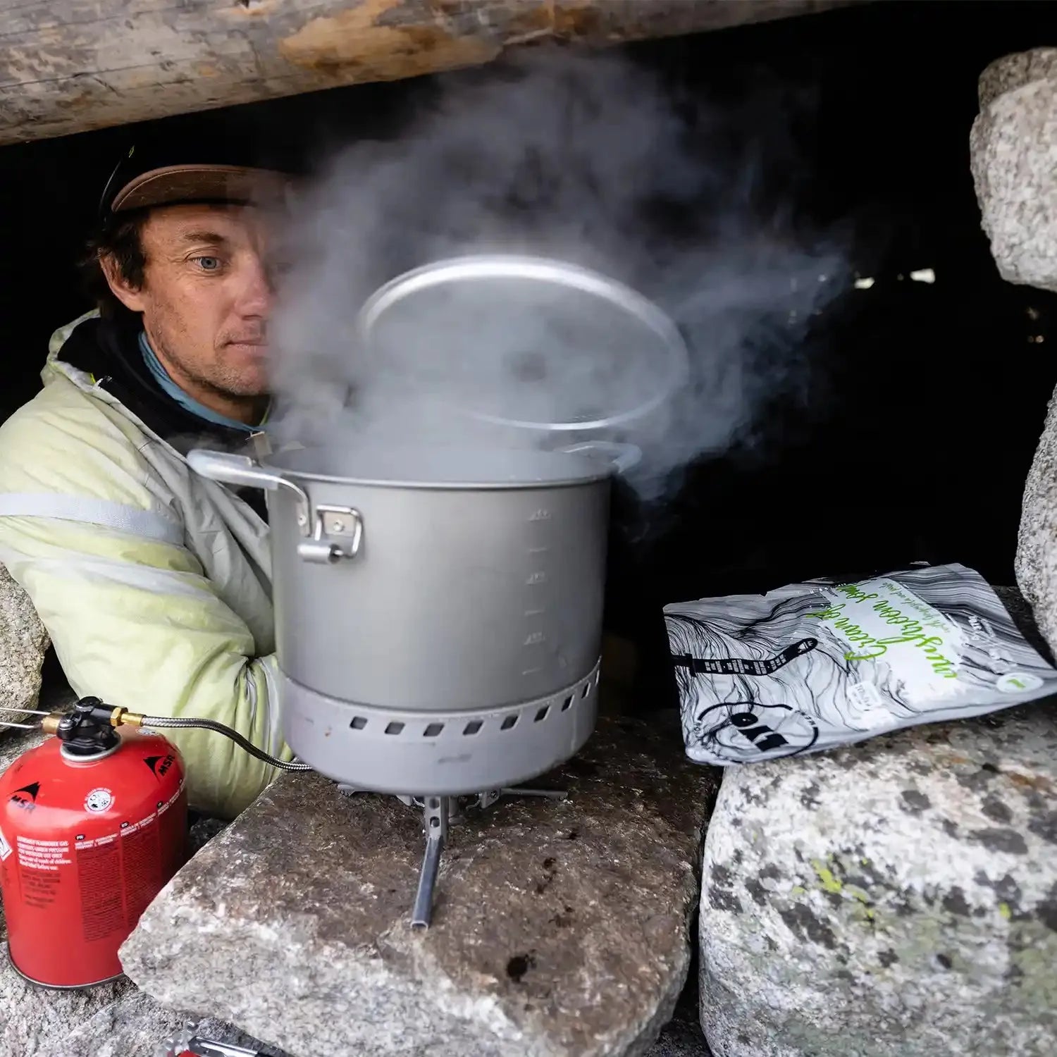 Tilsett kokende vann direkte i posen, rør godt og vent 6–8 minutter. Nyt en fyldig og varmende soppsuppe hvor som helst på turen.
