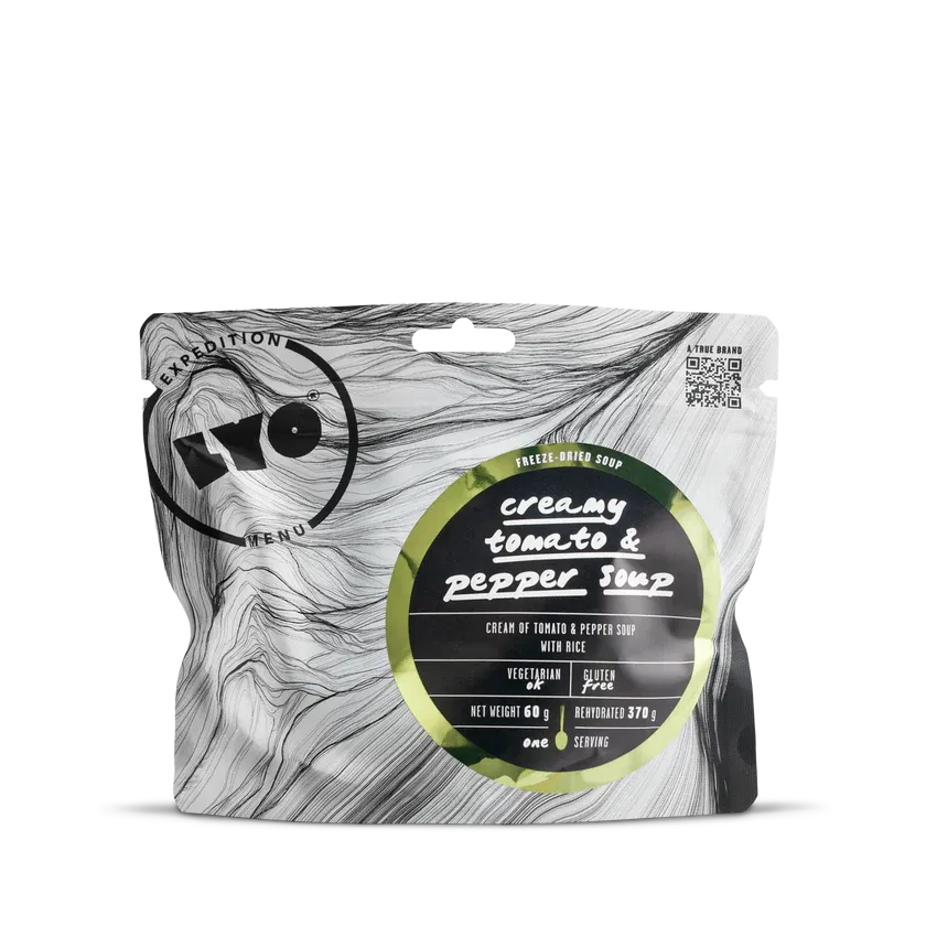 LYOFOOD Creamy Tomato & Pepper Soup kombinerer moden tomat og rød paprika i en kremet og varmende suppe. Laget med 100 % naturlige ingredienser, helt uten gluten og kunstige tilsetningsstoffer. Perfekt som lett middag, mellommåltid eller forrett på fjelltur, camping eller ekspedisjoner der rask energi og god smak er viktig.