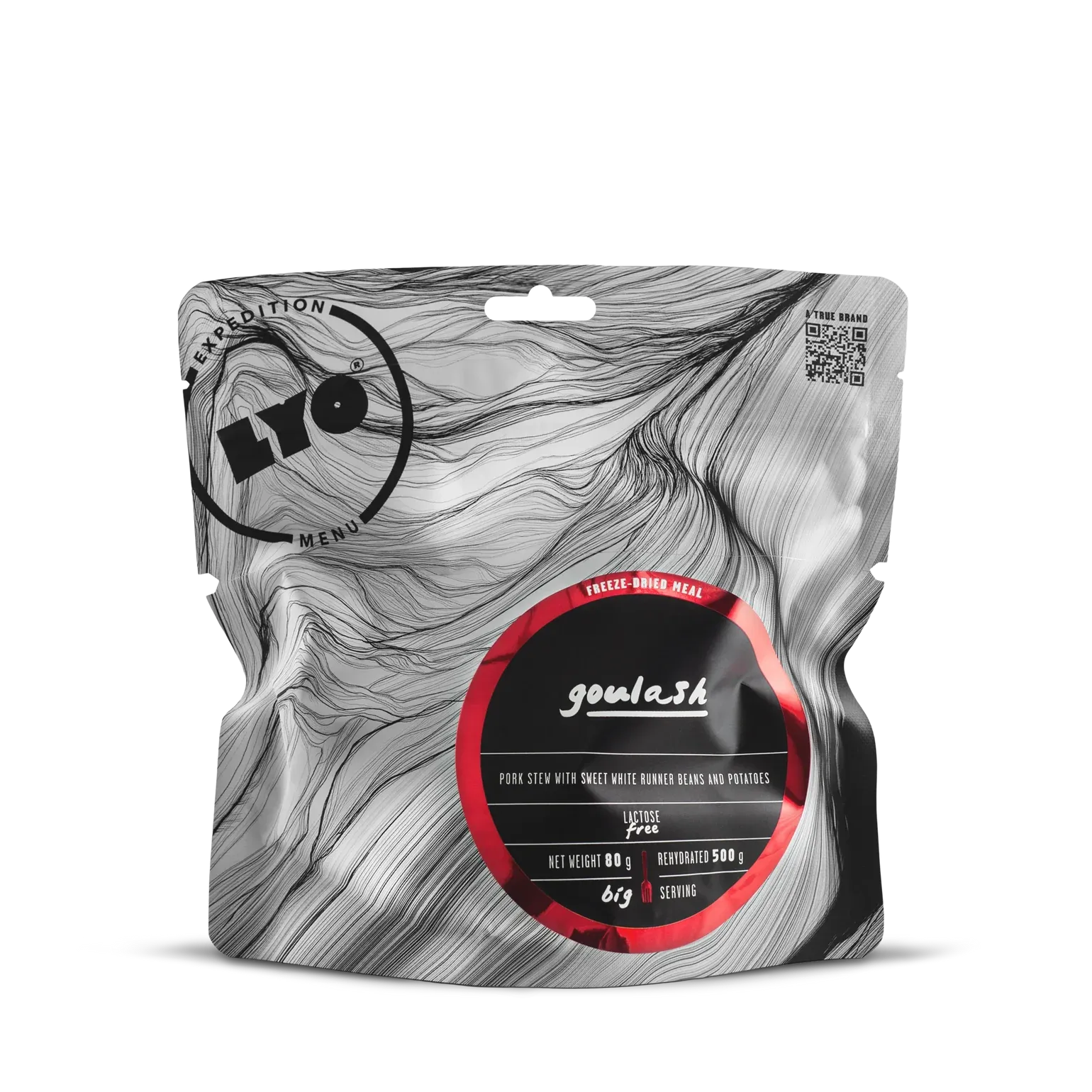 LYOFOOD Goulash er en varmende og smakfull svinegryte inspirert av den ungarske klassikeren. Retten inneholder møre biter av svinekjøtt, hvite bønner og potet i en kraftig tomatbasert saus sammen med gulrot, paprika og persillerot. Med 100 % naturlige ingredienser og lang holdbarhet er dette en perfekt middag for fjelltur, jakt eller ekspedisjon – uansett vær og sesong.