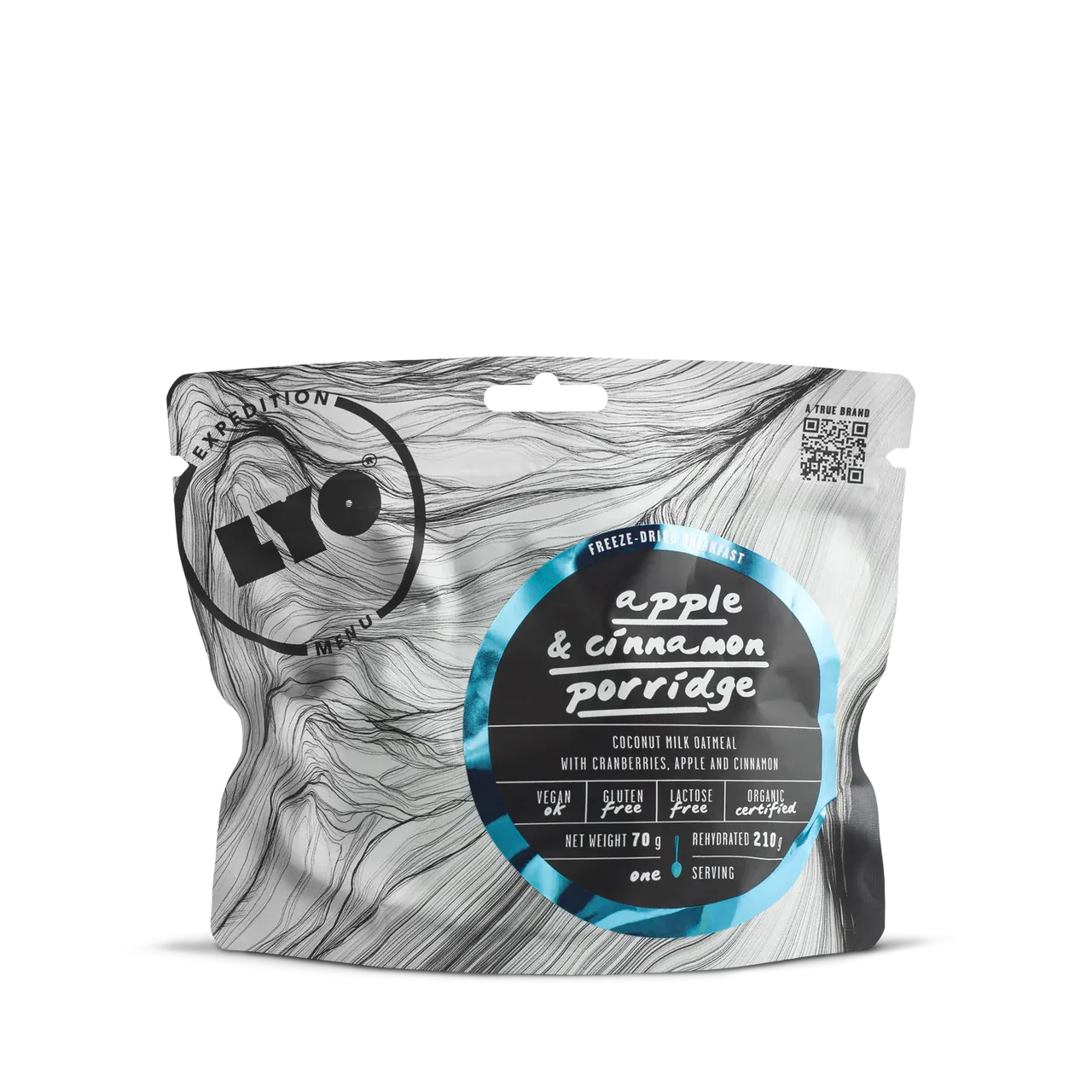 En deilig, høstinspirert frokost med smak av søte epler, kanel og kokosmelk. LYOFOODs Apple & Cinnamon Porridge er laget av økologiske og naturlige ingredienser – uten kunstige tilsetningsstoffer. Rik på fiber og langsomme karbohydrater, og perfekt for friluft, hytte eller beredskap.