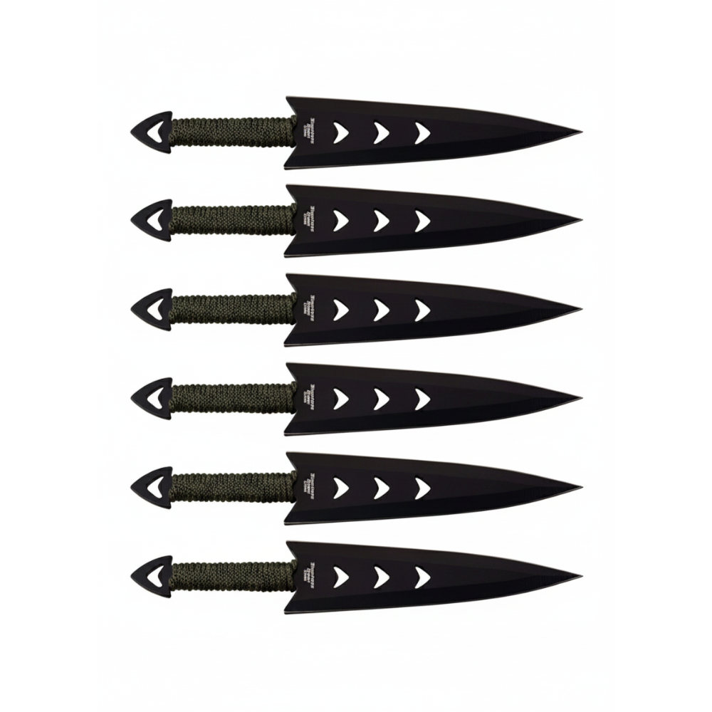 Knivene er konstruert i 3Cr13 rustfritt stål, et materiale som kombinerer god seighet med rustmotstand. Den svarte finishen på bladene gir dem et tøft, taktisk uttrykk, mens det grønne cord-wrap-grepet sørger for at kniven ligger stabilt i hånden før utkast. Dette er kniver bygget for "Target Sports", der balansepunktet er kritisk for resultatet.